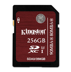 Kingston recently announced the addition of 128GB and 256GB capacities to its line of SDHC/SDXC UHS-I Speed Class 3 (U3) cards. The UHS-I U3 (Ultra High-Speed Bus, Speed Class 3) specification guarantees performance of at least 30MB/s read and write, and enough bandwidth to record and playback 4K video without interruption. Kingston’s SDHC/SDXC UHS-I Speed Class 3 card provides speeds of 90MB/s read and 80MB/s write, which is up to 9x faster (read) and up to 8x faster (write) than standard Class 10 SD cards. The faster speeds ensure the best video and photo integrity by reducing stutter as well as faster PC upload time, especially when using USB 3.0 card readers.