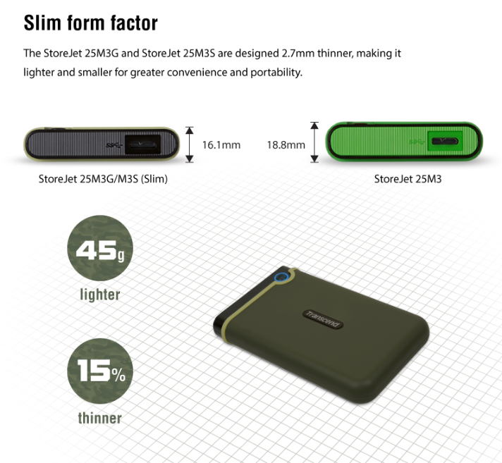 It also comes in a thinner and lighter package, weighing 45g lighter and 2.7mm thinner than the StoreJet 25M3, while retaining the iconic shock protection design. This allows greater convenience and portability, which makes the StoreJet 25M3G and 25M3S the perfect companion for those who is always on the go.