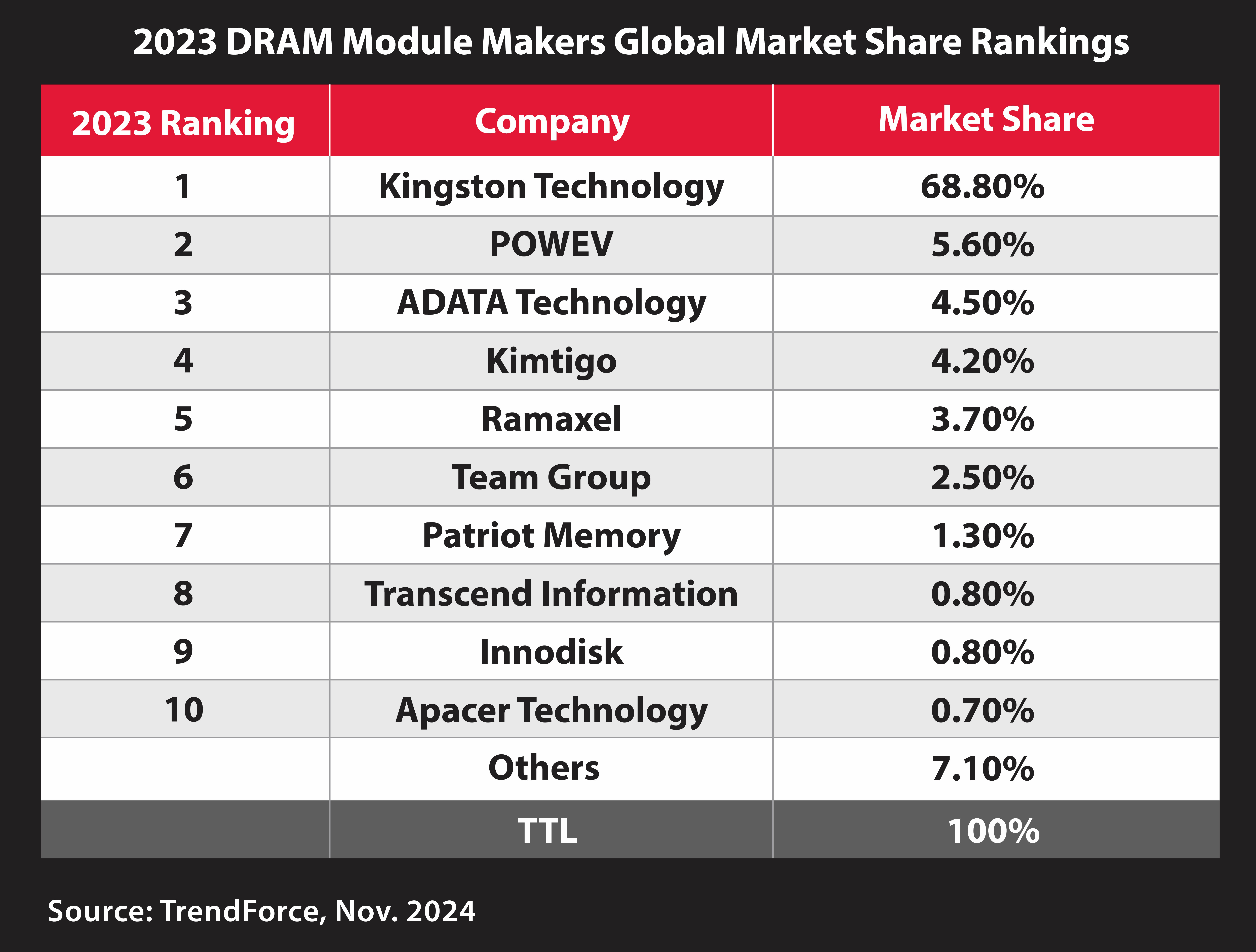 According to the report, the world’s top ten memory module houses accounted for 93% of total sales in 2023 with Kingston maintaining its dominant market share of 68.8%. The decline was mainly due to an inventory correction phase in the consumer electronics sector following the pandemic. This was exacerbated by high utilization rates among DRAM suppliers, which accelerated the price drop. However, the market started to recover in the second half of 2023. Consumer buying trends for electronic products took a hit following the pandemic but Kingston’s robust brand scale along with its comprehensive regional market layout limited its decline, keeping it firmly at the top of market share rankings.