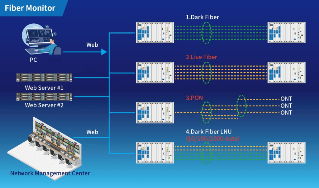 Fiber Monitor employs cutting-edge Light Source Unit (LSU) and Power Meter Unit (PMU) technology to provide 24/7 fiber cable monitoring. Unlike conventional methods that rely on periodic polling or manual handheld debugging, Fiber Monitor delivers instant anomaly detection. Whether it’s power loss or fiber damage, the system promptly triggers an Optical Time-Domain Reflectometer (OTDR) scan to pinpoint the exact fault location—streamlining issue resolution and preventing downtime.