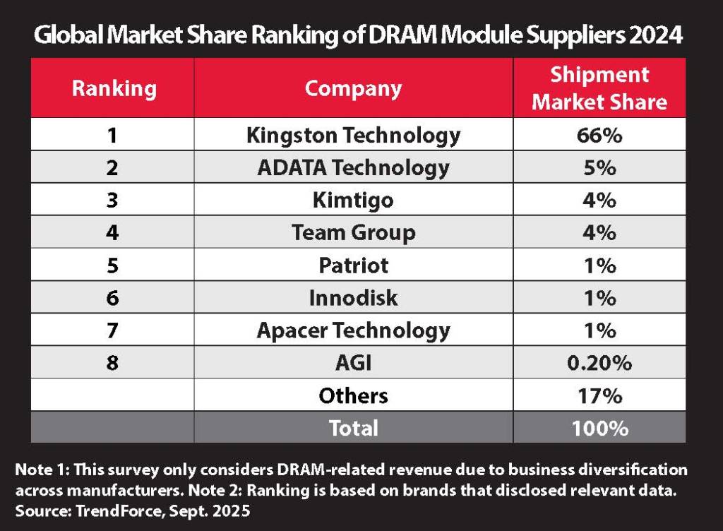 Kingston Technology, a world leader in memory products and technology solutions, today announced it has been ranked top third-party DRAM module supplier in the world, according to the latest rankings by revenue from analyst firm TrendForce. Kingston retains its number 1 position with an estimated 66% market share. TrendForce states DRAM module sales rose 7% YoY in 2024, reversing the 28% decline seen in 2023. Kingston maintained a strong market share, though its revenue growth slowed due to weaker consumer demand in the second half of 2024.