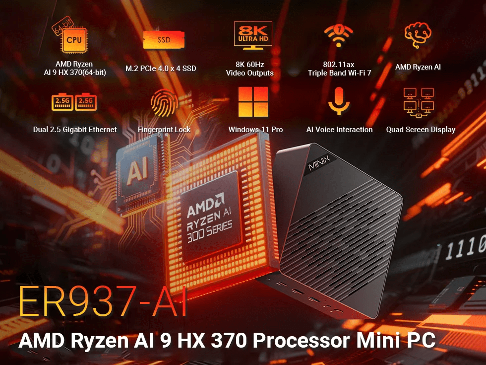 MINIX announces the Elite ER937 AI Mini PC, a high-performance compact desktop designed for professionals, creators, and gamers who demand desktop-grade power in a small, elegant form factor. Combining AMD’s latest Ryzen AI 9 HX 370 processor with a robust cooling system, advanced connectivity, and cutting-edge AI capabilities, the Elite ER937 AI redefines what users can expect from a mini PC.